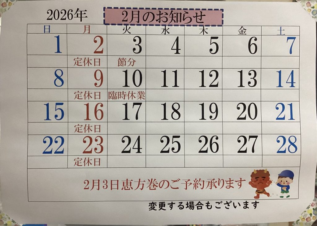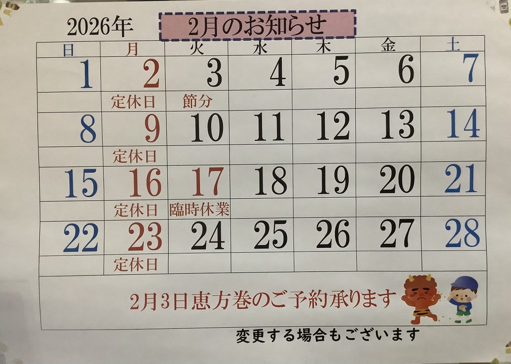 2月の店休日